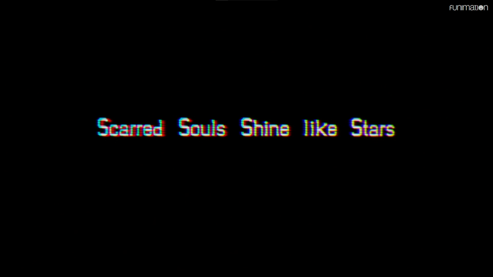 In the opening moments of Dynazenon, before the opening title card is shown, someone drops what looks like glass pebbles, glinting across the city. The screen goes black and the words Scarred Souls Shine like Stars appears, in the same CRT-colors-not-quite-aligned effect that Junk had in Gridman.